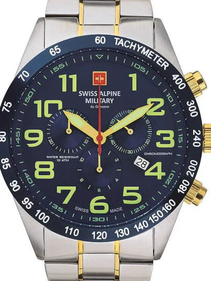 • Manufacturer no.: 7047.9145 • Manufacturer series: Chrono 45mm • Functions: Chronograph, Date, Hour, Minute, Second • Movement: Battery (quartz) • Dial color: Blue • Display: Analog • Water resistant: 10 • Surface finish: Matted, Polished • Case color: Silver • Case material: Stainless steel • Case thickness: 12 • Case shape: Round • Case width: 45 • Caseback: screwed, Stainless steel bottom • Gender: Mens • Glas: hardened, Mineral glass • Lighting: Illumin. hands, Illumin. indexes • Style: Sporty • Strap material: Stainless steel • Strap color: Gold, Silver • Lug width: 24 • Clasp: Folding clasp • Max wrist circumferences: 220 • Item weight: 0.17 • Scope of delivery: Box, Instruction, Packaging, Warranty documents
