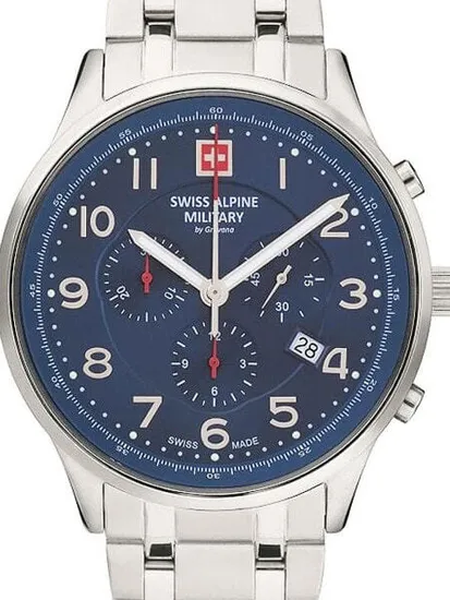 • Manufacturer no.: 7084.9135 • Manufacturer series: Chrono 43mm • Functions: Chronograph, Date, Hour, Minute, Second • Movement: Battery (quartz) • Movement label: 5030.D, Ronda, Swiss Made • Dial color: Blue • Display: Analog • Water resistant: 10 • Bezel: Fixed • Surface finish: Matted, Polished • Case color: Silver • Case material: Stainless steel • Case thickness: 12 • Case shape: Round • Case width: 43 • Caseback: screwed, Stainless steel bottom • Gender: Mens • Glas: hardened, Mineral glass • Lighting: Illumin. hands, Illumin. indexes • Style: Sporty • Strap material: Stainless steel • Strap color: Silver • Lug width: 22 • Clasp: Folding clasp • Max wrist circumferences: 210 • Item weight: 0.16 • Scope of delivery: Box, Packaging, Warranty documents