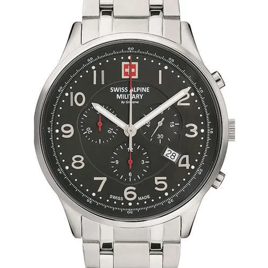 • Manufacturer no.: 7084.9137 • Manufacturer series: Chrono 43mm • Functions: Chronograph, Date, Hour, Minute, Second • Movement: Battery (quartz) • Movement label: 5030.D, Ronda, Swiss Made • Dial color: Black • Display: Analog • Water resistant: 10 • Bezel: Fixed • Surface finish: Matted, Polished • Case color: Silver • Case material: Stainless steel • Case thickness: 12 • Case shape: Round • Case width: 43 • Caseback: screwed, Stainless steel bottom • Gender: Mens • Glas: hardened, Mineral glass • Lighting: Illumin. hands, Illumin. indexes • Style: Sporty • Strap material: Stainless steel • Strap color: Silver • Lug width: 22 • Clasp: Folding clasp • Max wrist circumferences: 210 • Item weight: 0.16 • Scope of delivery: Box, Packaging, Warranty documents