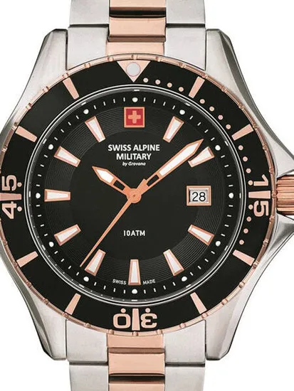 • Manufacturer no.: 7040.1157 • Manufacturer series: Herrenuhr 44mm • Functions: Date, Hour, Minute, Second • Movement: Battery (quartz) • Movement label: Swiss Made • Dial color: Black • Display: Analog • Water resistant: 10 • Bezel: counterclockwise, Turnable • Surface finish: Matted, Polished • Case color: Rosé gold, Silver • Case material: Stainless steel • Case thickness: 12 • Case shape: Round • Case width: 44 • Caseback: screwed, Stainless steel bottom • Gender: Mens • Glas: hardened, Mineral glass • Lighting: Illumin. hands, Illumin. indexes • Style: Sporty • Strap material: Stainless steel • Strap color: Rosé gold, Silver • Lug width: 22 • Clasp: Folding clasp • Max wrist circumferences: 220 • Item weight: 0.19 • Scope of delivery: Box, Packaging, Warranty documents