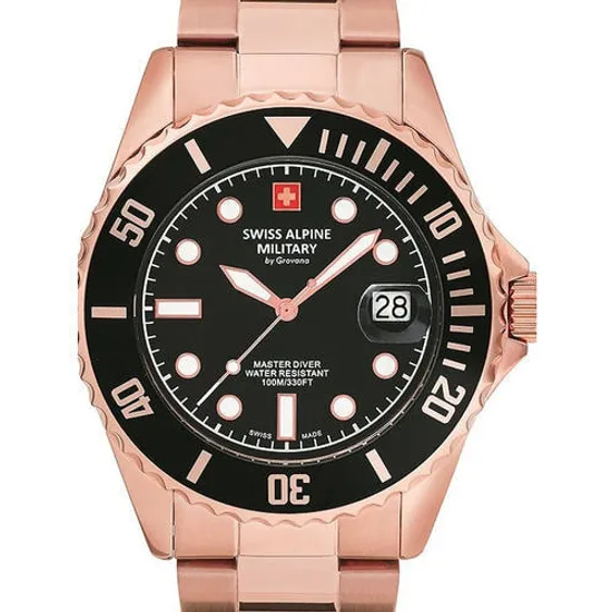 • Manufacturer no.: 7053.1167 • Manufacturer series: Herrenuhr 42mm • Functions: Date, Hour, Minute, Second • Movement: Battery (quartz) • Movement label: Swiss Made • Dial color: Black • Display: Analog • Water resistant: 10 • Bezel: counterclockwise, Turnable • Surface finish: Matted, Polished • Case color: Rosé gold • Case material: Stainless steel • Case thickness: 11 • Case shape: Round • Case width: 42 • Caseback: screwed, Stainless steel bottom • Gender: Mens • Glas: hardened, Mineral glass • Lighting: Illumin. hands, Illumin. indexes • Style: Sporty • Strap material: Stainless steel • Strap color: Rosé gold • Lug width: 22 • Clasp: Folding clasp • Max wrist circumferences: 210 • Item weight: 0.16 • Scope of delivery: Box, Packaging, Warranty documents