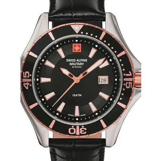 • Manufacturer no.: 7040.1557 • Manufacturer series: Herrenuhr 44mm • Functions: Date, Hour, Minute, Second • Movement: Battery (quartz) • Movement label: Swiss Made • Dial color: Black • Display: Analog • Water resistant: 10 • Bezel: counterclockwise, Turnable • Surface finish: Matted, Polished • Case color: Rosé gold, Silver • Case material: Stainless steel • Case thickness: 12 • Case shape: Round • Case width: 44 • Caseback: screwed, Stainless steel bottom • Gender: Mens • Glas: hardened, Mineral glass • Lighting: Illumin. hands, Illumin. indexes • Style: Sporty • Strap material: Calf leather • Strap color: Black • Lug width: 22 • Clasp: Buckle clasp • Max wrist circumferences: 220 • Item weight: 0.09 • Scope of delivery: Box, Packaging, Warranty documents