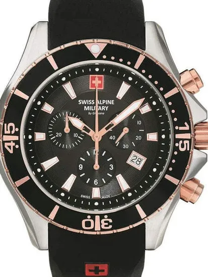 • Manufacturer no.: 7040.9857 • Manufacturer series: Chrono 44mm • Functions: Chronograph, Date, Hour, Minute, Second • Movement: Battery (quartz) • Movement label: Swiss Made • Dial color: Black • Display: Analog • Water resistant: 10 • Bezel: counterclockwise, Turnable • Surface finish: Matted, Polished • Case color: Rosé gold, Silver • Case material: Stainless steel • Case thickness: 12 • Case shape: Round • Case width: 44 • Caseback: screwed, Stainless steel bottom • Gender: Mens • Glas: hardened, Mineral glass • Lighting: Illumin. hands, Illumin. indexes • Style: Sporty • Strap material: Silicon • Strap color: Black • Lug width: 22 • Clasp: Buckle clasp • Max wrist circumferences: 220 • Item weight: 0.11 • Scope of delivery: Box, Packaging, Warranty documents